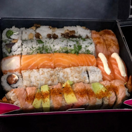 6 sushi saumon, 6 california saumon + 2 accompagnements offerts au choix.