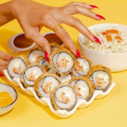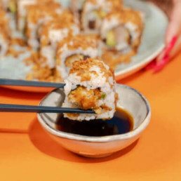 Crevette tempura, avocat, concombre, aneth, ciboulette, coriandre, mayonnaise, algue nori et riz vinaigré. 6 pièces.